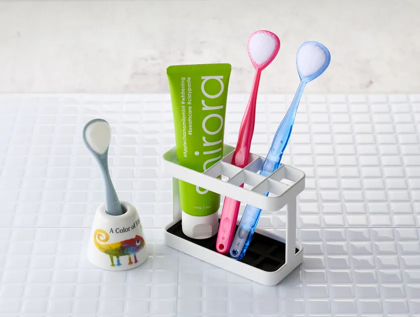 口腔内の悩みには、「むし歯」や「歯周病」など健康に関わるものから、「歯並び」「歯の着色」といった美容的な悩み、そして「口臭」があります。むし歯や歯並び、着色などは“歯”をケアしますが、口臭の主な原因は“舌”にあると言われており、“舌”のケアが必要です。また、お口の中を調理器具に例えると、歯は“包丁”で、舌は“まな板”であると考えます。いくら包丁をキレイにしても、まな板も洗わなければ不衛生ですよね?お口のケアも、歯(包丁)磨きにプラスして舌(まな板)を磨く、「舌ブラシ」を使った舌磨きの習慣を提案いたします。