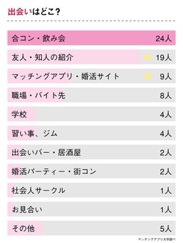 警察官と出会った場所として一番多かったのが「合コン・飲み会(24人)」でした。2位は「友人・知人の紹介(19人)」、3位が「マッチングアプリ・婚活サイト(9人)」でした。