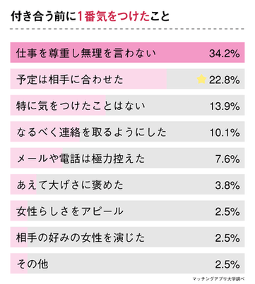 付き合う前に気をつけたことは「警察官という仕事を尊重し、無理を言わないようにした」が34.2%でダントツ1位でした。2位は「時間や日程だけは相手にできるだけ合わせるように心がけた(22.8%)」でした。