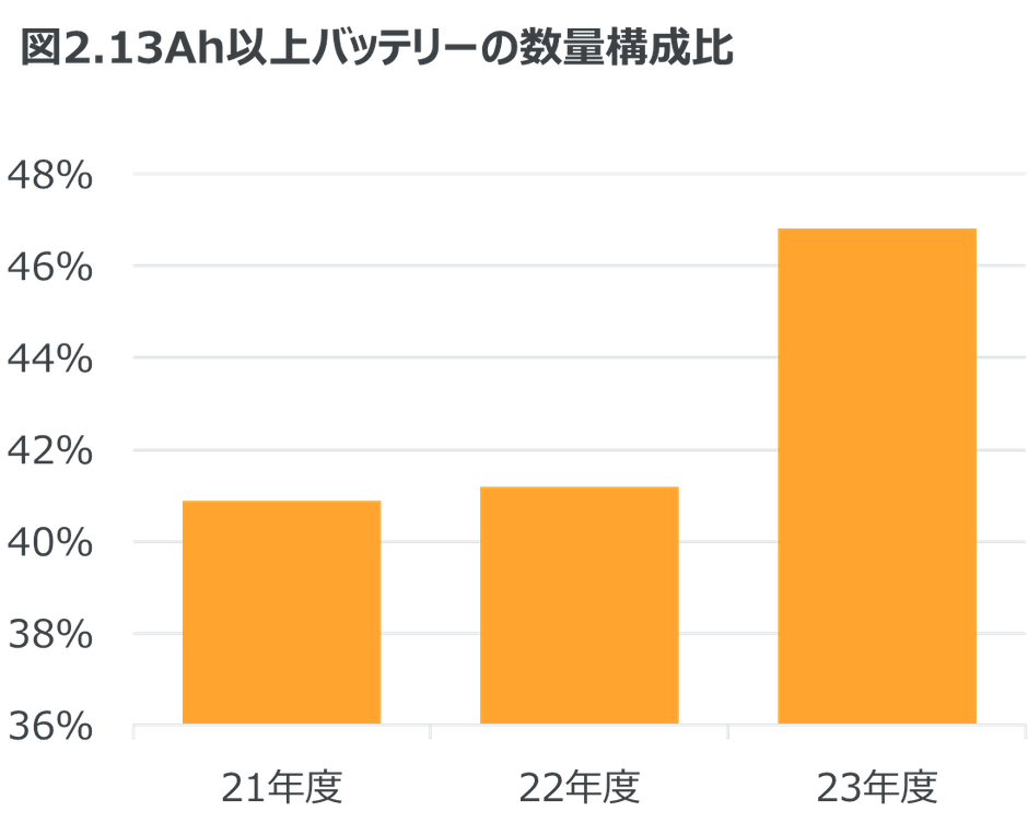 電動アシスト自転車の平均価格は上昇傾向にあり、1台あたり114,027円と前年に比べて6%上昇した。価格の上昇の背景として、新モデルの投入と13Ah以上の大容量バッテリーを搭載するモデルの拡大が挙げられる(図2)。大容量バッテリーを搭載したモデルが増えた要因は二つ考えられ、一つはバッテリー容量の大きいモデルが多いシティー車の販売が拡大したことが挙げられる。加えて、ホーム車でも大容量のバッテリーを搭載したモデルの増加が見られ、ホーム車における13Ah以上のモデルの数量構成比は33%を占めるに至った。こうした価格の上昇が支えとなり、数量ベースでは前年を下回ったものの販売金額では前年並みを維持した。