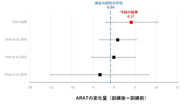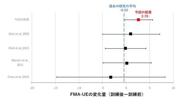 しかしながら、こうしたスコアの上昇が維持期の患者さんの平均的な回復である可能性もあります。そこで、過去の同じような維持期の患者さんを対象とした研究※8,9,10,11 のコントロール群(通常、一般的なリハビリを行う群)のデータと比較しました(表1)。今回の検証による各指標のスコア変化量は(FMA平均+2.70、ARAT平均+4.2)は、先行研究における各指標のスコア変化量の平均値(FMA平均-0.52、ARAT平均-0.86)を上回り、少数例ではあるものの本検証の有効性が期待される結果となりました。