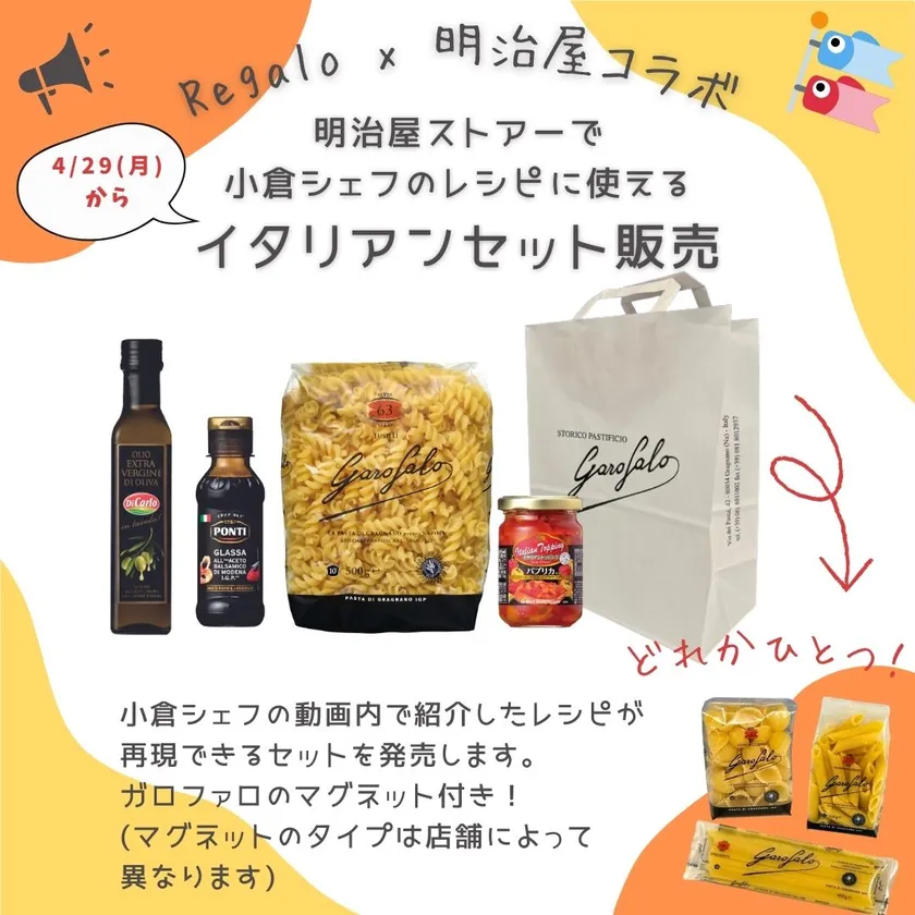 イタリアンレストラン『Regalo』と『明治屋』がコラボ! Regaloキッズデーにご招待! 「Instagram ガロファロ ショートパスタ 写真投稿キャンペーン」開催中 小倉シェフのレシピに使えるイタリアンセットの販売も!