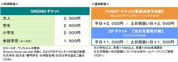 ※(2)および(3)に記載の営業日は、フォレストアドベンチャーの営業開始時間も30分前倒し(9:45)します(事前決済予約制)。ロングジップスライドは9:00より当日先着順にて受付いたします。フォレストアドベンチャーの事前予約は公式HPよりご確認ください。