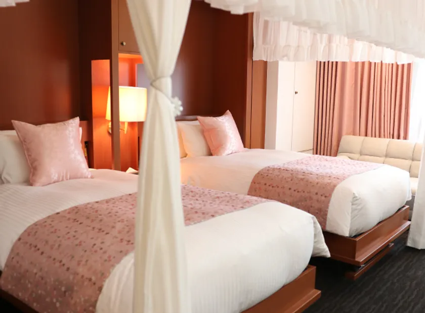 レースの天蓋やブーケ型のライトでお姫様気分にさせてくれる華やかな空間で、ReFaの美容アイテムや豊富なアメニティによりエレガントなお部屋になっております。
