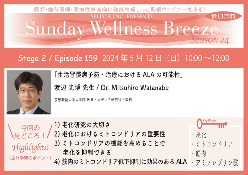 《医師・歯科医師・薬剤師向け》 無料オンラインセミナー5/12(日)朝10時開催 『生活習慣病予防・治療におけるALAの可能性』 講師:渡辺 光博 先生 (慶應義塾大学 大学院 政策・メディア研究科/教授)
