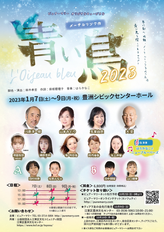有限会社ピュアーマリー(東京都目黒区、代表:保坂 磨理子)主催、ピュアーマリーオリジナルミュージカル『青い鳥』が2023年1月7日 (土) ~2023年1月9日 (月・祝)に豊洲文化センター 豊洲シビックセンターホール(東京都江東区豊洲2-2-18豊洲シビックセンター)にて上演されます。