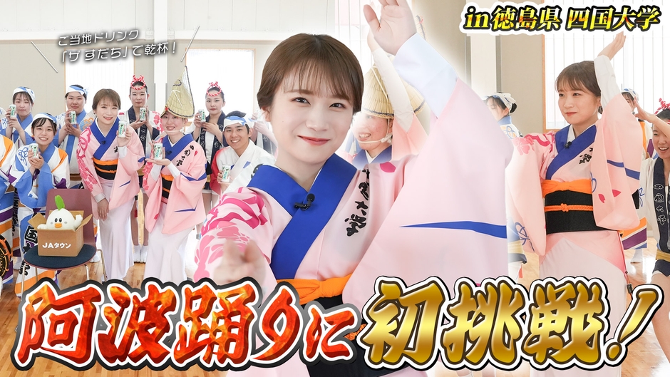 今回の配信は、JAタウンオフィシャルサポーターの秋元真夏さんが、徳島県の四国大学を訪問。阿波踊りの歴史や伝統にふれ、人生初の阿波踊りに挑戦します。また、踊りの後は、全員ですっきりさわやかな風味が楽しめる、徳島県産「ザ すだち」で乾杯し、水分補給をしました。