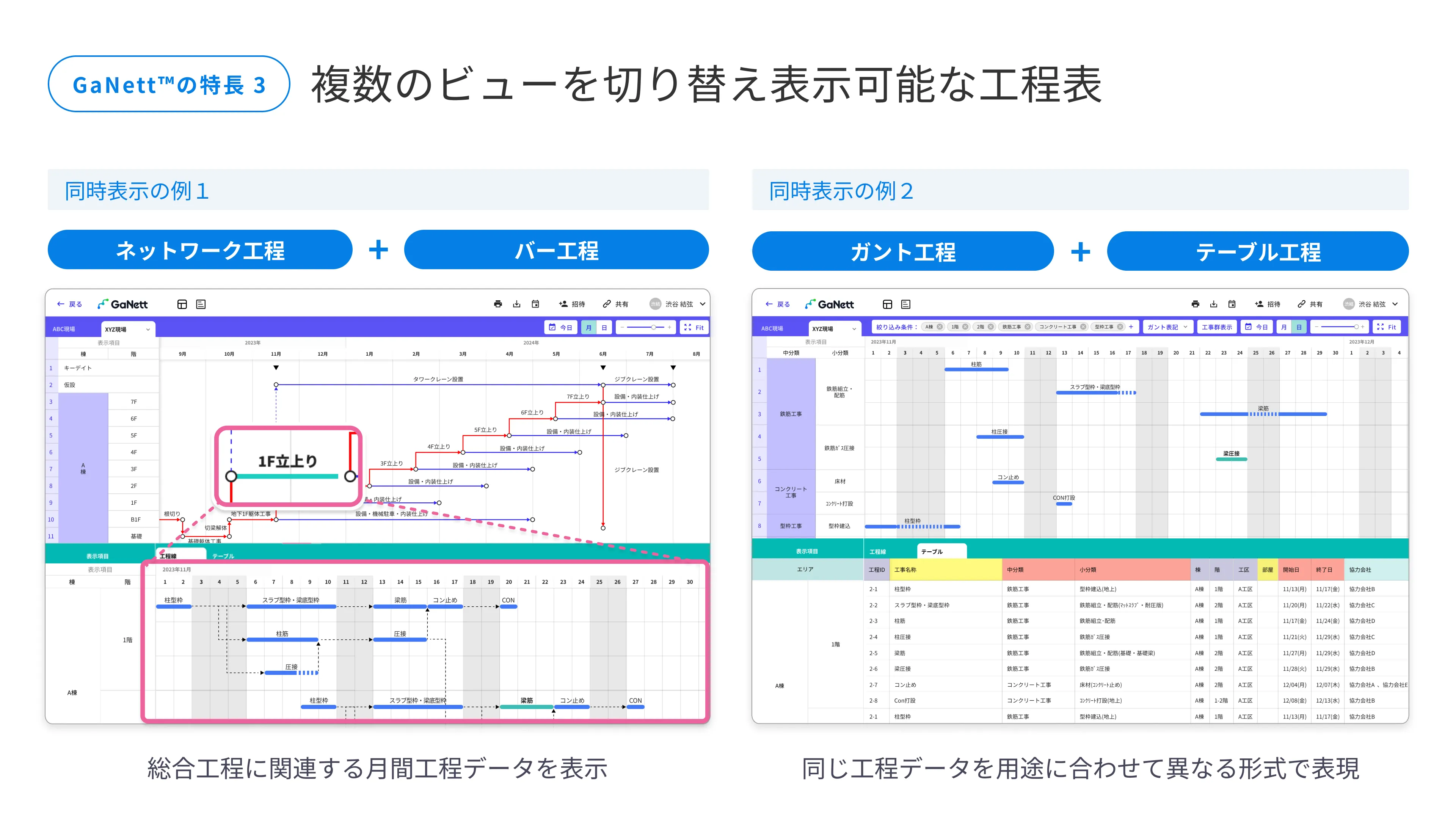 これまで個別で作成していた総合・月間・週間工程表を関連付けて作成でき、見たい粒度で表示することが可能です。また、工程のつながりを表示したいときはネットワーク工程やバー工程で表示、表形式で表示したいときはテーブル工程で表示するなど、登録されたデータを用途に合わせて表示させることができます。合わせて、テーブル工程で修正した内容は、ネットワーク工程・バー工程・ガント工程にも同時に反映されます。