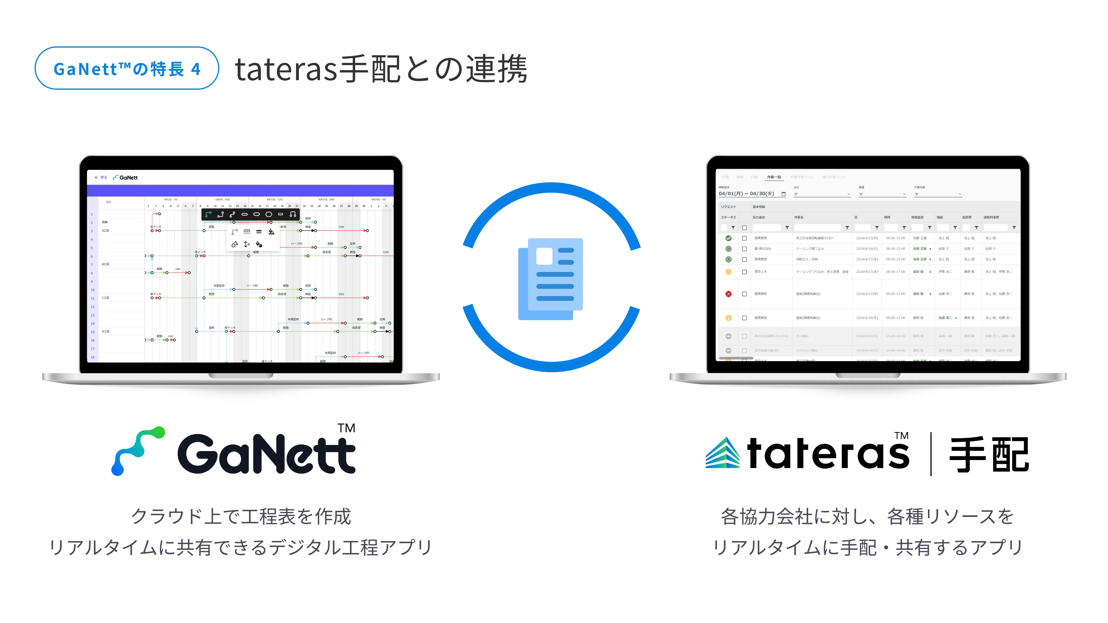 NTT Comが提供する、協力会社に対し、各種リソースをリアルタイムに手配・共有するアプリである「tateras手配」とデータ連携することで、工程計画に合わせた手配が可能となり、作業手配の抜け漏れを減らします。また、手配の情報を各協力会社と共有・管理することで、調整の手間を大きく低減します。