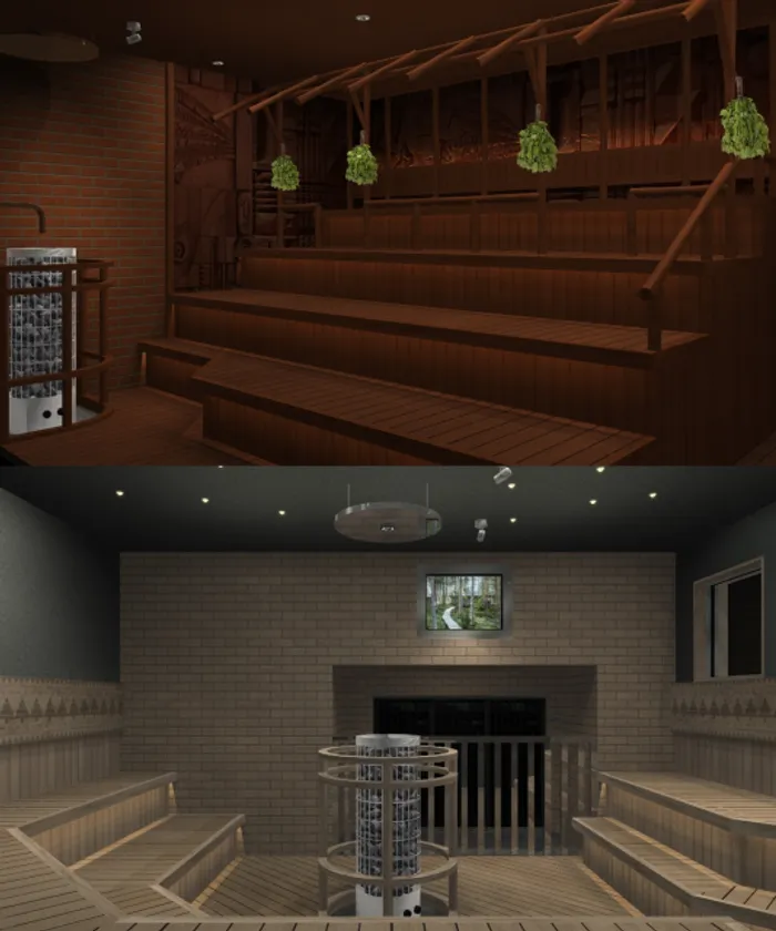 男女ともにヴィヒタが配置され、男性サウナ室では、「北の地で暮らす先住民の住居」をモチーフにした設計となっており、ベンチ最上段170cmと下段40cmの高低差による温度差やレンガ作りの壁面が本場である、北欧の雰囲気を演出します。