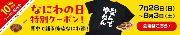7月28日のなにわの日から先着100注文に、俺流デザイナーTシャツを通常価格より10%オフになるクーポンを配布いたします。この機会に、ご自宅用はもちろん、ギフト用としてもぴったりなオリジナル商品をお求めください。