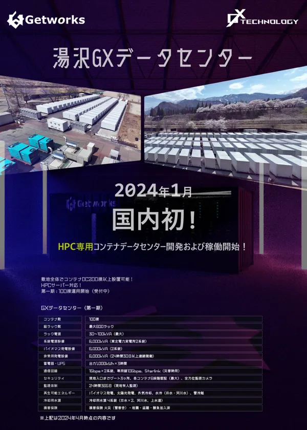 株式会社ゲットワークス(本社:埼玉県さいたま市、代表取締役:天野 純、以下 ゲットワークス)が設計・開発したコンテナデータセンター「コンテナサーバ図」を、株式会社GXテクノロジー(本社:新潟県湯沢町、代表取締役:瀧澤 泰三、以下 GXテクノロジー)が運用する再生可能エネルギー100%のコンテナデータセンター「湯沢GXデータセンター」内に設置して運用。