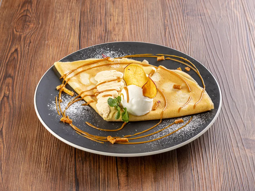 自家製の有機チョコレートソースとお芋のカスタードがクレープ生地に絡みつき、豊かな味わいが一層深まります。