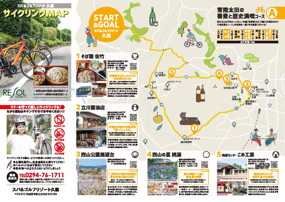 「スパ&ゴルフリゾート久慈」を起点に、Aコース(常陸太田の蕎麦と歴史満喫コース)、Bコース(イタリアンと季節の体験交流コース)の2つの周遊コースがあり、利用者に提供するそれぞれのサイクリングマップには、周辺を楽しんでいただけるよう、季節ごとに楽しめる様々な体験スポット、食事スポットが紹介してあります。なお、坂道や勾配の強い道路でも、電動アシスト付自転車なので幅広い層の方がサイクリングをお楽しみいただけます。