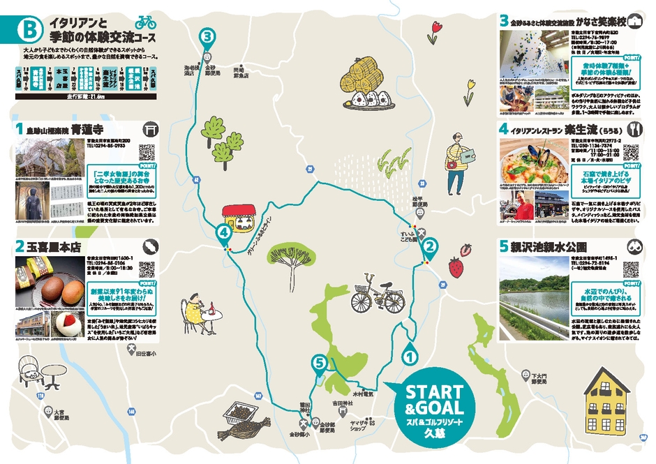 ■Bコース(イタリアンと季節の体験交流コース)大人から子どもまでわくわくの自然体験ができるスポットから地元の食を楽しめるスポットまで、豊かな自然が満喫できるコース。(走行距離:21.6㎞)