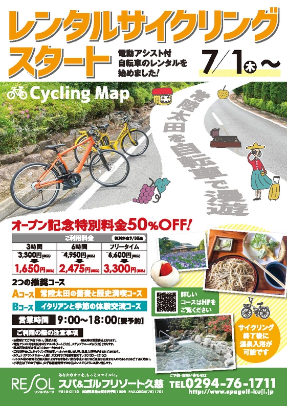 「スパ&ゴルフリゾート久慈」は、フェアウェイフロントに佇むゴルフヴィラとクラブハウスの正面に建つリゾートホテルの2タイプの宿泊施設を備え、天然温泉が楽しめる上質なリラクゼーションリゾートとして、ゴルフ旅行をはじめ、家族旅行、女子旅など、ゴルファー以外にも幅広く人気があります。そんな中、魅力のある周辺スポットを宿泊利用者にもっと気軽に満喫いただくように、地元観光資源や体験施設などの常陸太田の魅力スポットを電動自転車で漫遊していただく『レンタルサイクリング』を企画しました。(オープン記念特別料金50%OFFを設定)