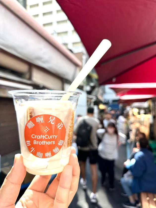 黒毛和牛を使ったキーマカレーで作る焼きカレーパンを、食べやすくカットしてカップに入れ、フォークを付けて提供するため、築地グルメ食べ歩きとして最適です。