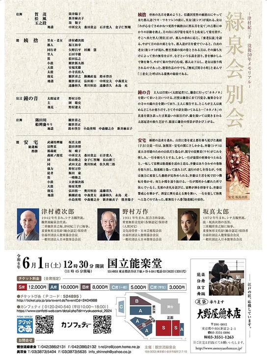 観世流緑泉会(代表:津村禮次郎)主催、津村紀三子没後50年メモリアル「緑泉会 別会」が2024年6月1日(土)に国立能楽堂(東京都 渋谷区 千駄ヶ谷 4-18-1)にて開催されます。チケットはカンフェティ(運営:ロングランプランニング株式会社、東京都新宿区、代表取締役:榑松 大剛)にて発売中です。