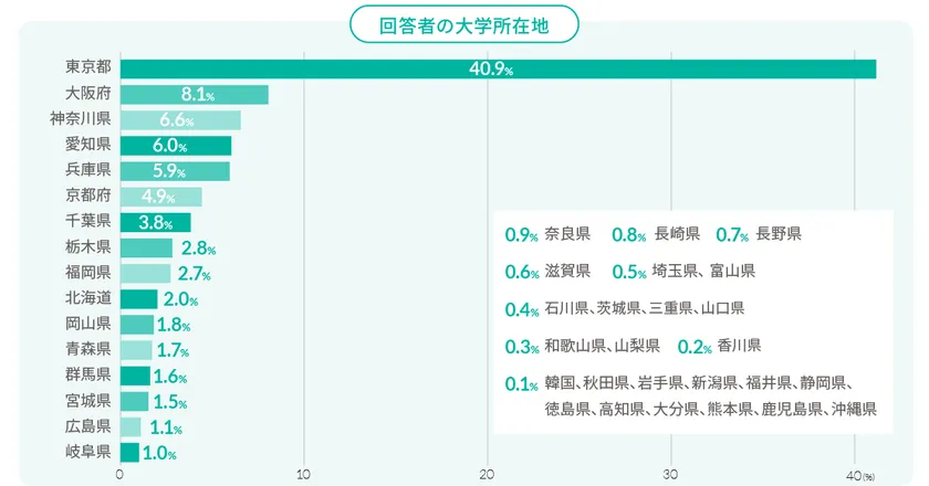 また、回答者の大学を所在地(都道府県)別に見ると、東京都が40.9%を占め、以下大阪府(8.1%)神奈川県(6.6%)、愛知県(6.0%)が上位となっています。