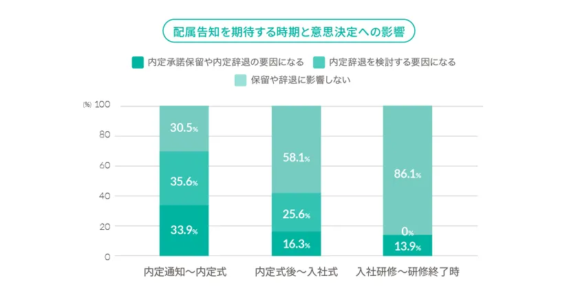 売り手市場の影響を受けて内定承諾後でも辞退する学生が増加しており、配属先の告知時期は最終的な入社の決断要因となり得ることがわかります。