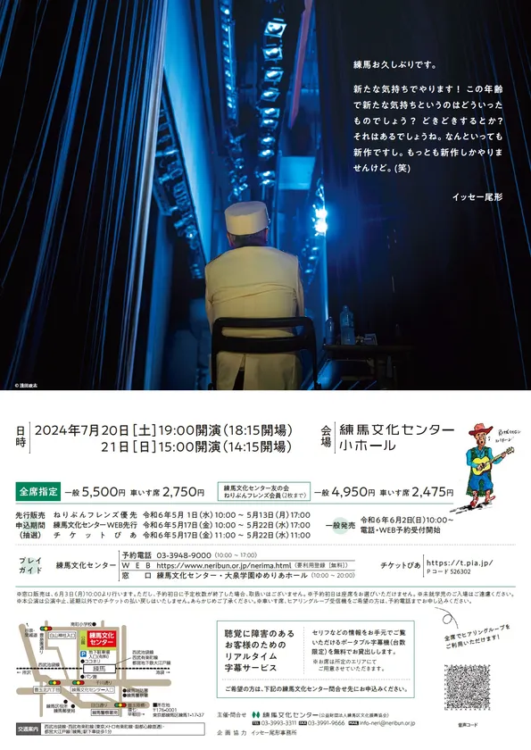 ※車いす席、ヒアリングループ受信機をご希望の方は、予約電話(03-3948-9000)またはメール( info-neri@neribun.or.jp )までお申し込みください。