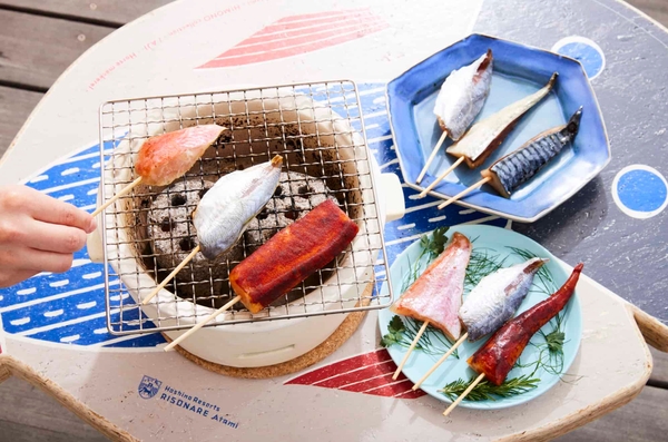 本客室では、テラスにて干物を七輪の上で炙って味わうことが可能です。伝統的な味付けの「クラシック干物」とハーブやスパイスなどを合わせた液に漬ける新しい味付けの「アップデート干物」の食べ比べセットを用意します。食べ比べを通して、クラシック干物の香ばしい味わいや、アップデート干物の鼻に抜けるスパイスの風味を感じられます。また、干物が干される網をイメージしたハンモックが登場。目の前に広がる相模湾を眺めながら、干物をとことん堪能できるひとときです。