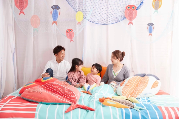 ベッドルームに、干物が干される網をイメージしたカラフルなベッドカバーや天蓋、干物をモチーフにしたガーランドを設えます。また、干物の顔がデザインされたナイトキャップと、ヒレのモチーフ付きのパジャマを用意。金目鯛とアジの2種類のデザインがあり、家族みんなで着用して干物になりきることができます。干物クッションと一緒に眠ることで、まるで干物に仲間入りした気分になります。