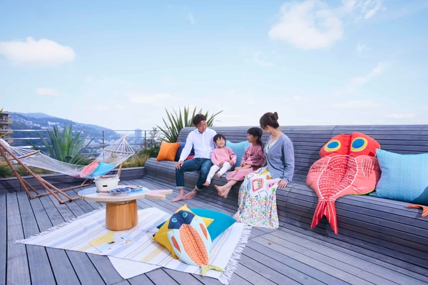 158平米の広々としたテラス付き客室のリビングルームに、干物をモチーフにしたテーブルやクッションを設えます。カラフルな配色によってわくわくする、干物尽くしの空間です。干物クッションに囲まれて写真を撮ったり、干物をモチーフにデザインされたマグカップでティータイムを楽しんだりすることができます。滞在を通して干物と一緒に過ごせるのは、本客室ならではの体験です。