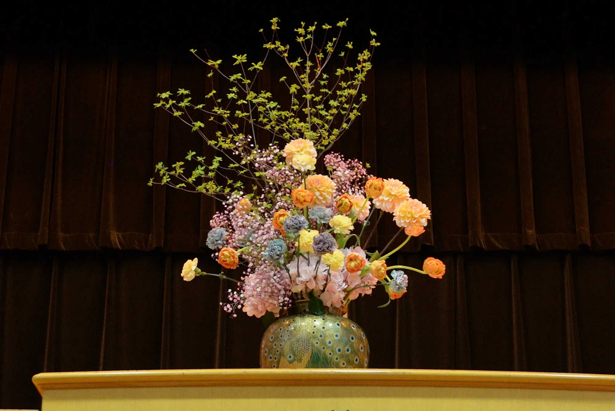イベント当日は、日比谷花壇の社員から、日頃お世話になっている人へ「ありがとう」の気持ちを伝える大切さなどをお話しした後、全校児童約460名に向けてカーネーションを贈呈しました。さらに今年は特別ゲストに歌手の海蔵亮太さんを招き、海蔵さんの生歌唱とともに当社のフローリストが壇上で季節の花々を使った特大アレンジメントを制作する、「歌と花」のコラボレーションパフォーマンスをサプライズで行いました。体育館に響き渡る海蔵さんの圧巻の歌声と普段あまり見ることのない大きなアレンジメントがつくりあげられる様子を目の前にした大興奮の子どもたちからは、終始歓声が鳴りやまず、大盛況のうちにイベントは終了しました。