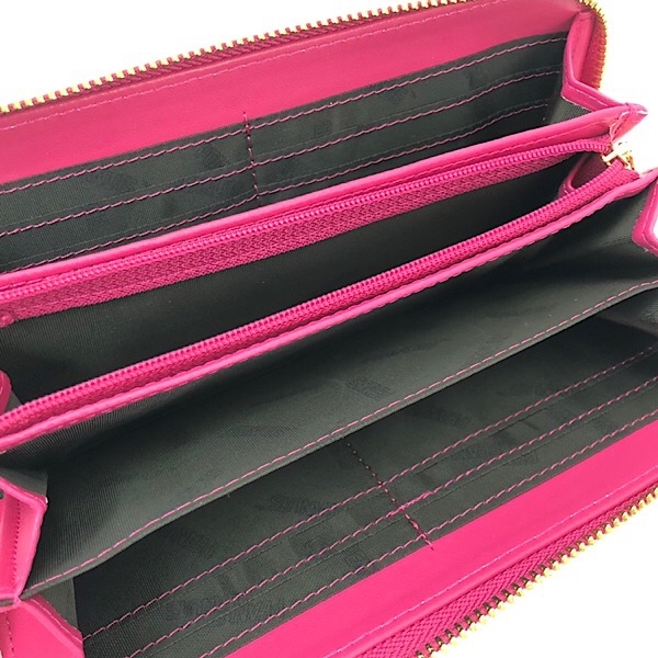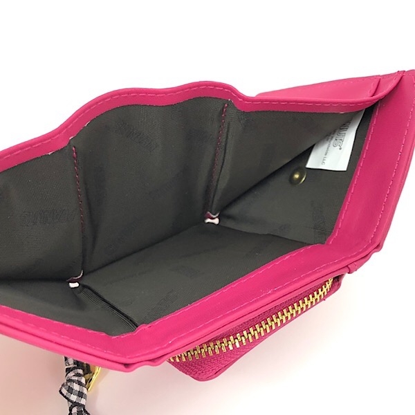 ショッキングピンクの長方形ウォレットです。ファスナー部分の白黒のチェックのリボンがアクセント。デザインはシンプルなので、使いやすいです。
