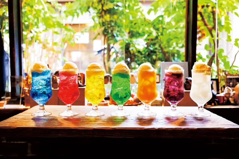 1955年創業の老舗喫茶の名物「7色のクリームソーダ」。王道のメロン味のほか、ブルーハワイ、イチゴ、レモン、オレンジ、ブドウ、カルピス味をご用意。
