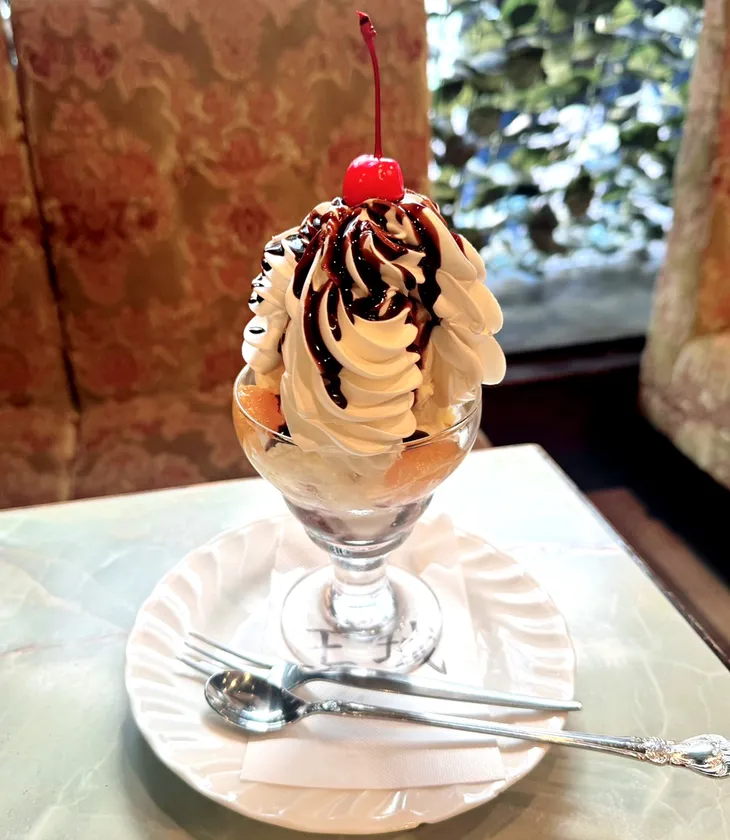 生クリームたっぷり、ボリューム満点な1杯。上野のお店で提供している高さ約25cmのパフェを、東武限定の食べやすいサイズでご用意。