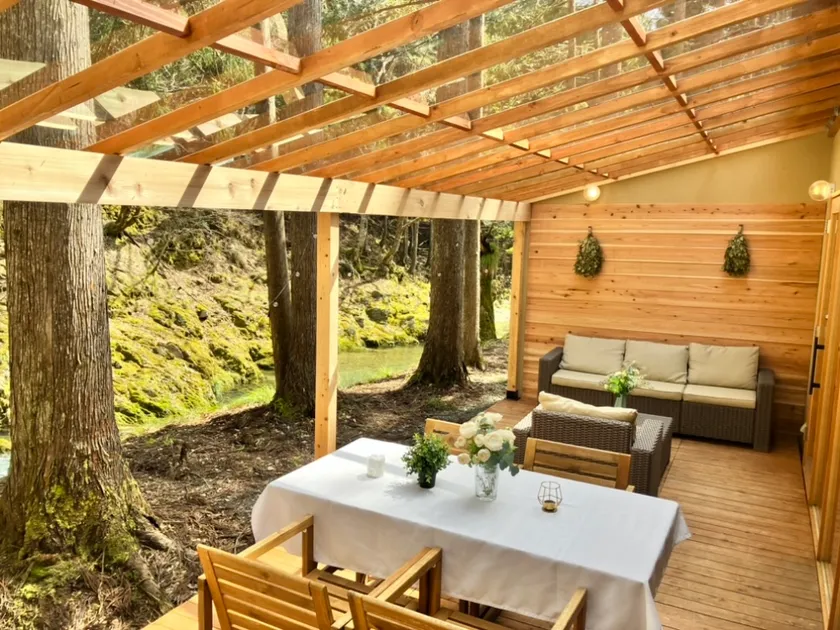 Soil smallhotel & privateglampingは、1,500坪の敷地内に3棟のヴィラが点在するサウナ付きのリバーサイドグランピングです。