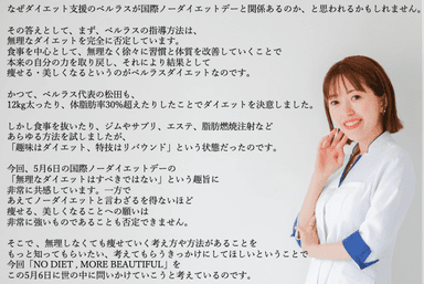 ベルラスは無理なダイエットではなく、食事・食習慣を改善することで本来の自分を取り戻してその結果として美しくなる「ベルラスメソッド」を提供しています。そこで国際ノーダイエットデーに合わせて、無理なダイエットを世の中から無くすため、本キャンペーンを実施する運びとなりました。