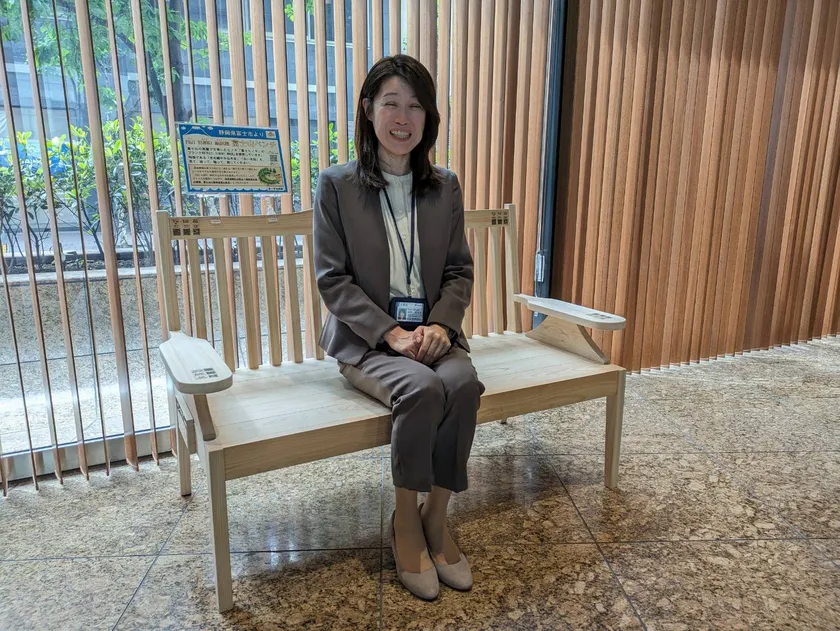 設置した「富士ヒノキ製 富士山ベンチ」に座る風間支社長