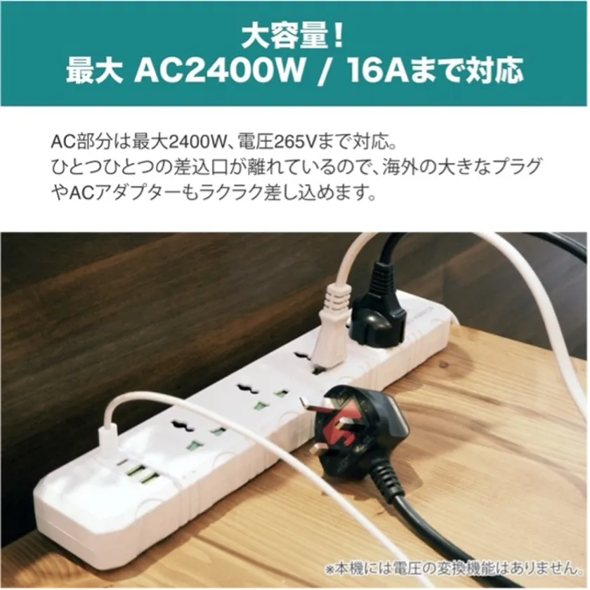 最大AC2,400W/16A、USB DC5V 3.1A(USB-C PD急速充電対応×2個、USB-A IQスマート充電対応×2個)。