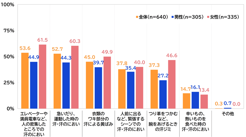 また、3位以降についてもみると、3位は「衣類のワキ部分の汗による黄ばみ」で45.0%、4位は「人前に出るなど、緊張するシーンでの汗・汗のにおい」で37.8%、5位は「つり革をつかむなど、腕をあげるときの汗ジミ」で37.3%、6位は「辛いもの、熱いものを食べた時の汗・汗のにおい」で14.7%でした。