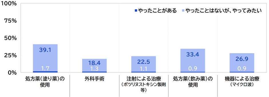 また、“医療機関でできる対策”についてみると、実施経験率はいずれも1%前後にとどまっているものの、「やったことはないが、やってみたい」との実施意向率は、「処方薬(塗り薬)の使用」では39.1%、「処方薬(飲み薬)の使用」では33.4%、「機器による治療(マイクロ波)」では26.9%、「注射による治療(ボツリヌストキシン製剤等)」では22.5%、「外科手術」では18.4%となりました。医療機関でできる対策をやったことがあるという人は少ないものの、やってみたいと思っている人は少なくないことがわかりました。