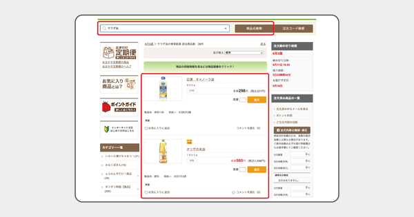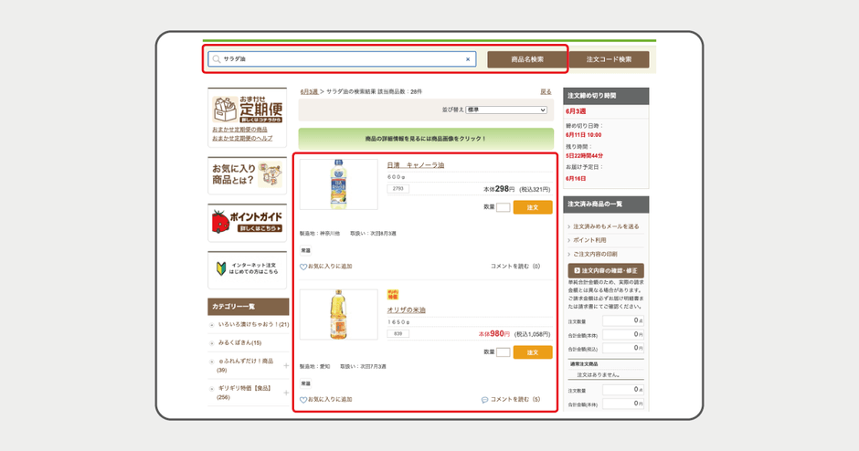 例:「サラダ油」と検索すると、「キャノーラ油」「米油」など検索ワードと関連した商品が表示されます