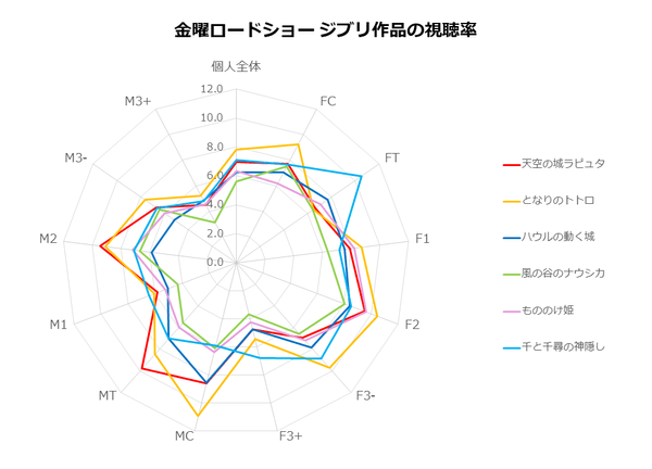 このように性年代別の分析からは、全体の個人視聴率だけではわからない、ジブリ作品ごとに人気の視聴者層が明確になります。