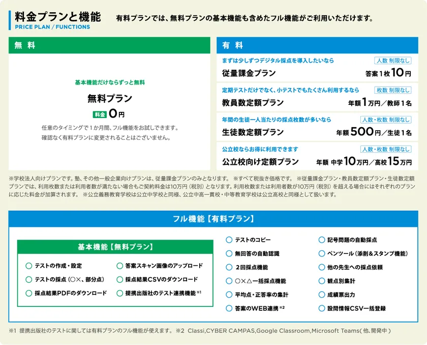 公立校で導入しやすい価格での特別なプランです。システムを利用する教員数や採点を行うテスト数の制限はございません。