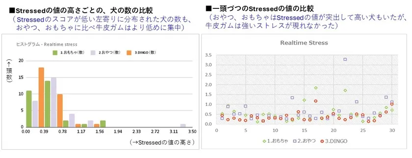 おやつ、おもちゃ、牛皮ガムの「Stressed」値比較