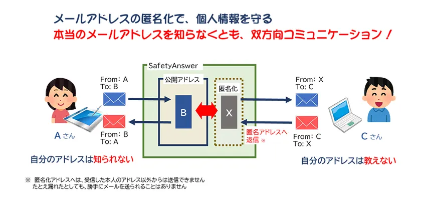 さらに、匿名化アドレスへ送信ができるのは、メールを受信した本人のアドレスからだけとなっている為、他人がメールを盗み取って勝手に送信しようとしても送信が受け付けられない安全性も備えています。