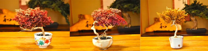 盆栽アート作家、藤田 茂男氏の監修の元、本物の盆栽の木、葉を使用して創る、新たな試みです。もっと気軽に盆栽を楽しんでいただきたいという気持ちを込め、世界で初めてプレゼントボックスに入れた盆栽商品を作成いたしました。急増しているインバウンド旅行客のお土産にもぴったりの商品です。盆栽枝葉の種類は、松柏類の皮を剥ぎ磨き上げた盆栽樹を基本に、コニファー類をプリザーブド加工で色を付け、ドライ化した葉を使用しております。葉の色はレッド、イエロー、グリーンの3パターン。世界に一つだけのオリジナルドライ盆栽をお楽しみください。