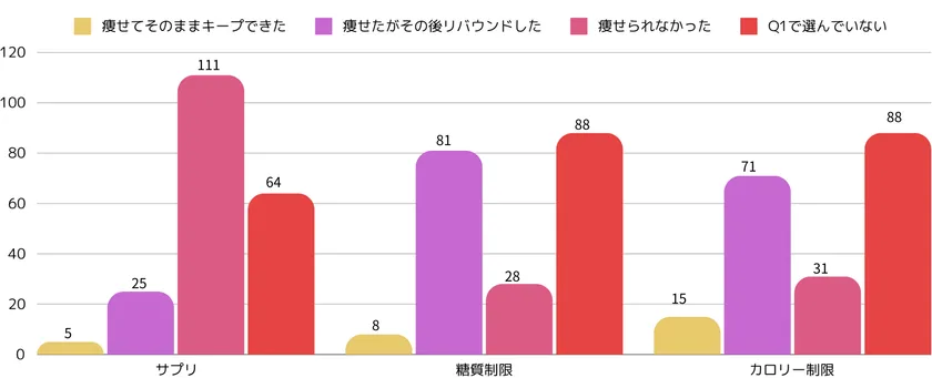 ・ダイエット方法についてほとんどの方が「リバウンドを経験した」「そもそも痩せられなかった」と回答している。