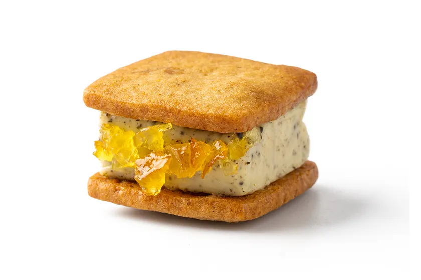 和歌山産ぶどう山椒の爽やかな風味と、カカオの華やかな香りが堪能できるサンド。お酒と合わせてもおいしい大人な味わい。