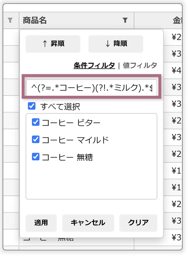 FlexGridのフィルタの検索機能を強化し、ワイルドカードや正規表現を使用したフィルタリングができるようになりました。文字列の一部しかわからない、または一部だけを抽出したい場合に、ワイルドカード(?, *, ~)を使って高度な検索を実行できます。