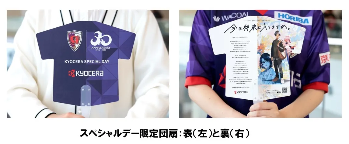 先着 8,000 名に京セラスペシャルデー限定団扇をプレゼントいたします。京都サンガF.C.のユニフォーム型のデザインで、裏面には京セラ発オリジナルアニメ第三弾「今は将来に入りますか。」のイラストを記載したオリジナル団扇です。