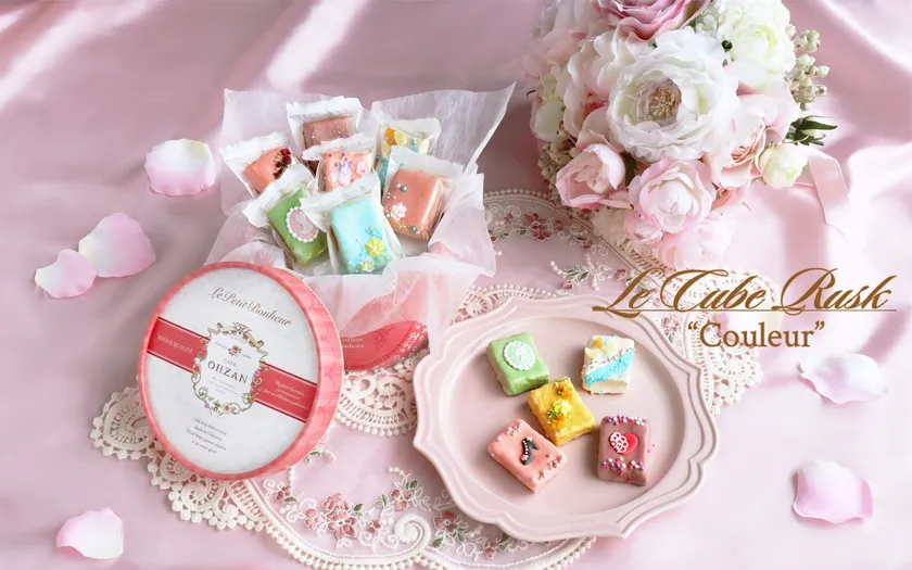 キューブラスクは、3×4cmほどのサイズのお菓子。小さなパレットに細かな装飾が施されています。可愛さがぎゅっと詰まっていて、芸術品のよう。5個入は引き出し型、12個入は筒形と、パッケージも珍しい形になっています。