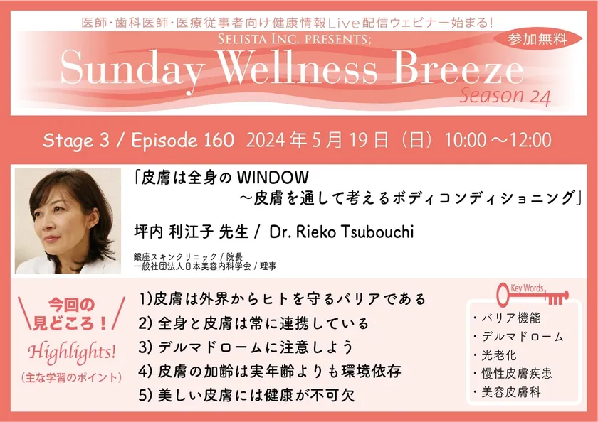 セリスタ株式会社(東京都千代田区 代表取締役 伊藤 承正)は、2024年5月19日(日)に、坪内 利江子 先生(銀座スキンクリニック/院長)を講師にお迎えし、医師・歯科医師などの医療従事者向け無料Zoomオンラインセミナー『皮膚は全身のWINDOW~皮膚を通して考えるボディコンディショニング』を開催します。